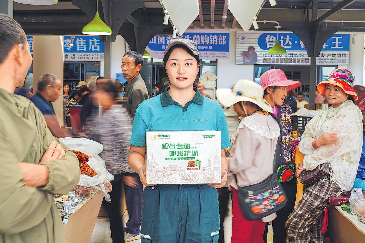9月17日清晨,楚雄州南华县邮政分公司员工随菌农上山采摘松茸,实现林下至邮路无缝衔接。